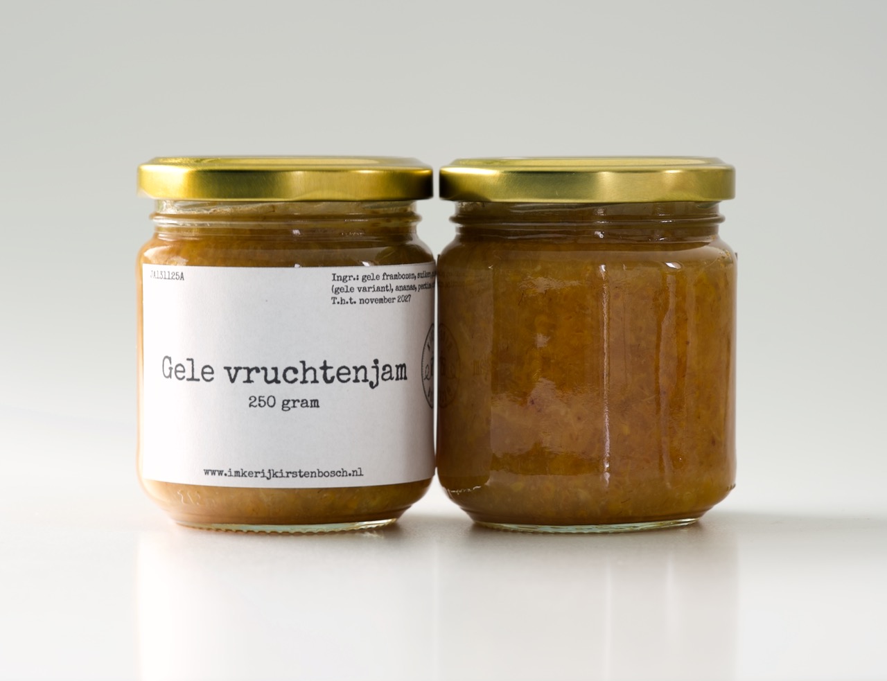 Ingrediënten: gele frambozen, suiker, gele kornoelje (gele variant), ananas, pectine, citroenzuur