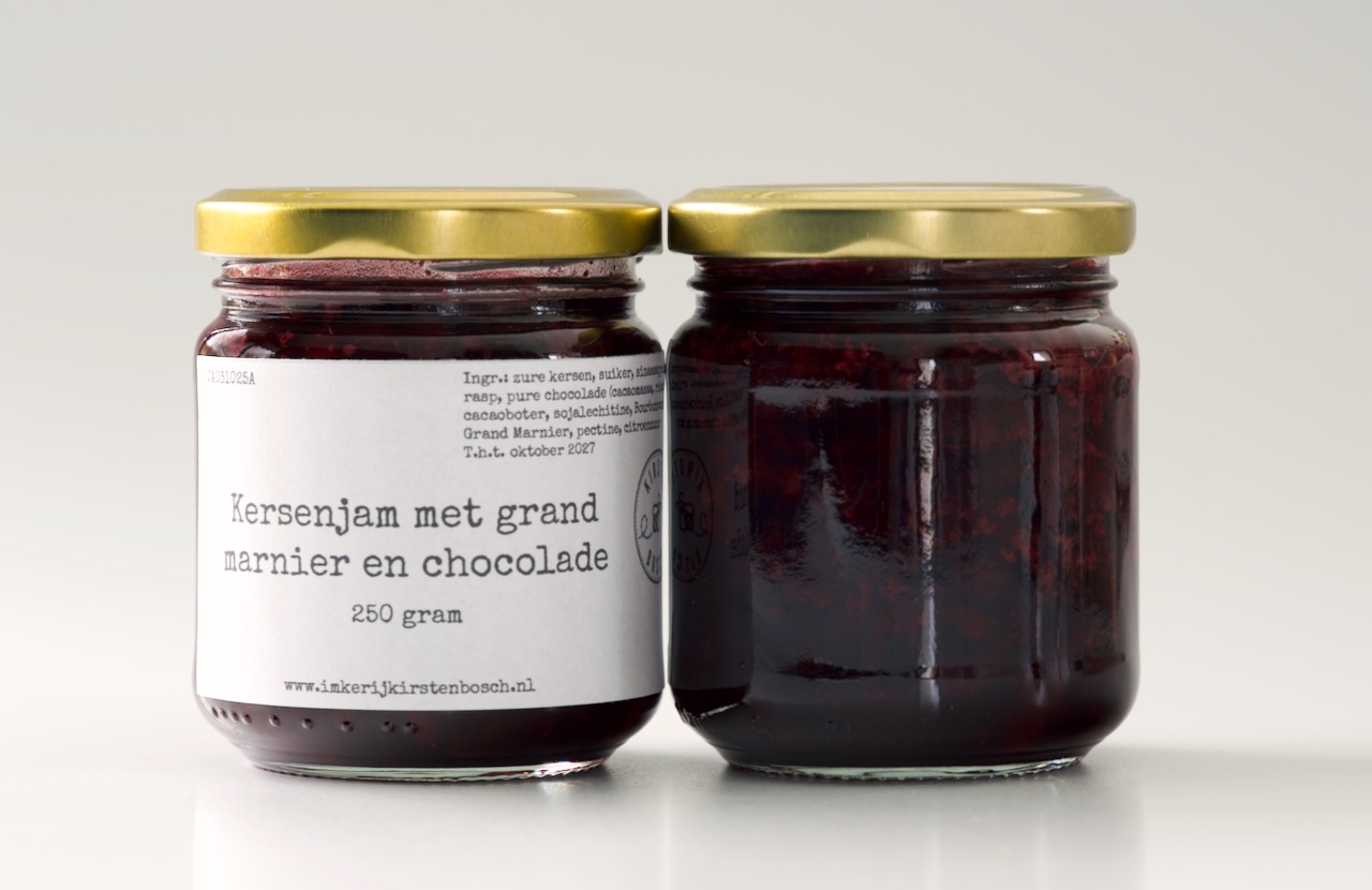 Kersenjam van onbespoten zure kersen uit de boomgaard van de imkerij. Met vegan, biologische pure chocolade en Grand Marnier.