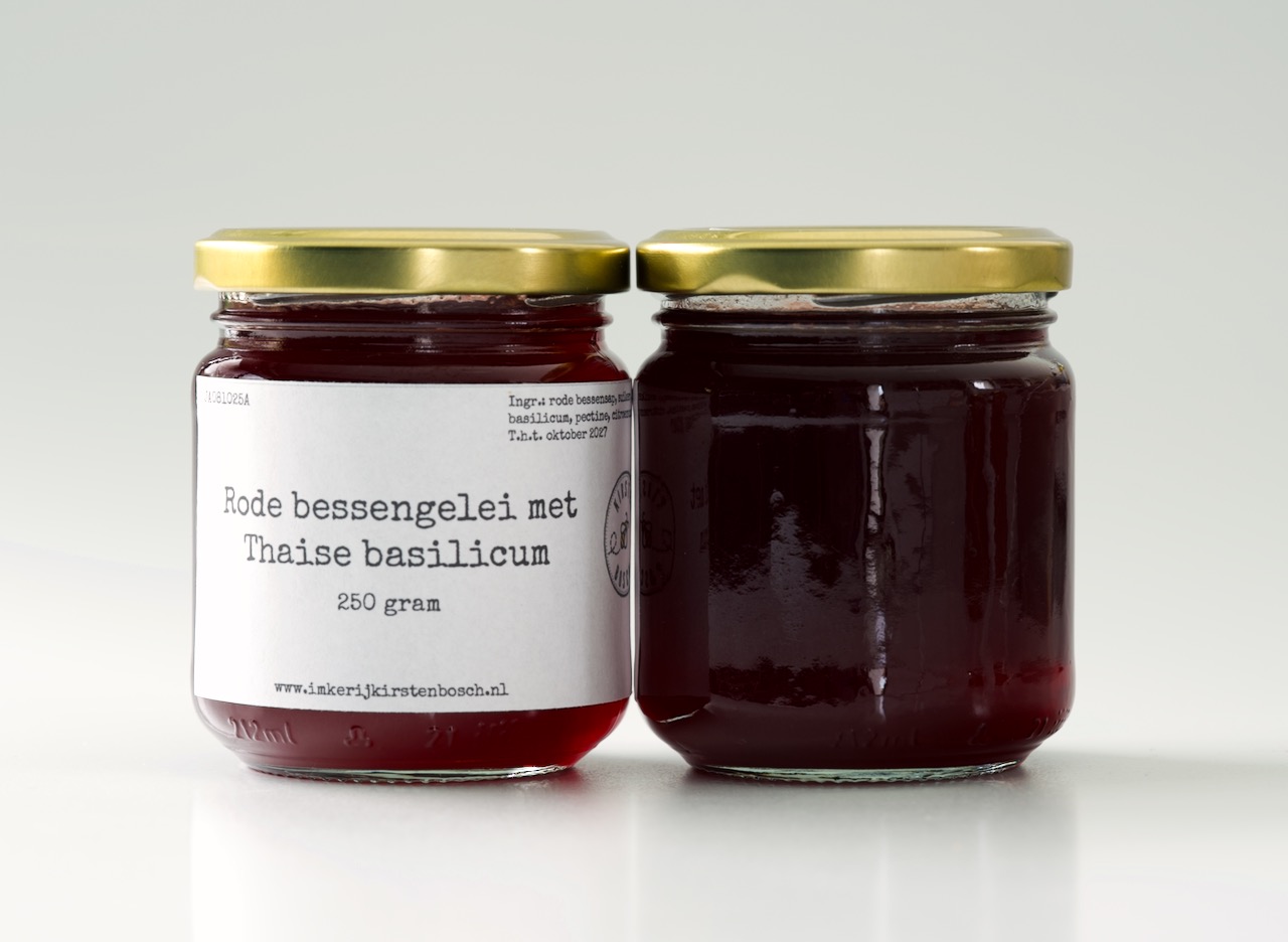 Van onbespoten rode bessen (aalbessen) en Thaise basilicum uit de tuin van de imkerij.