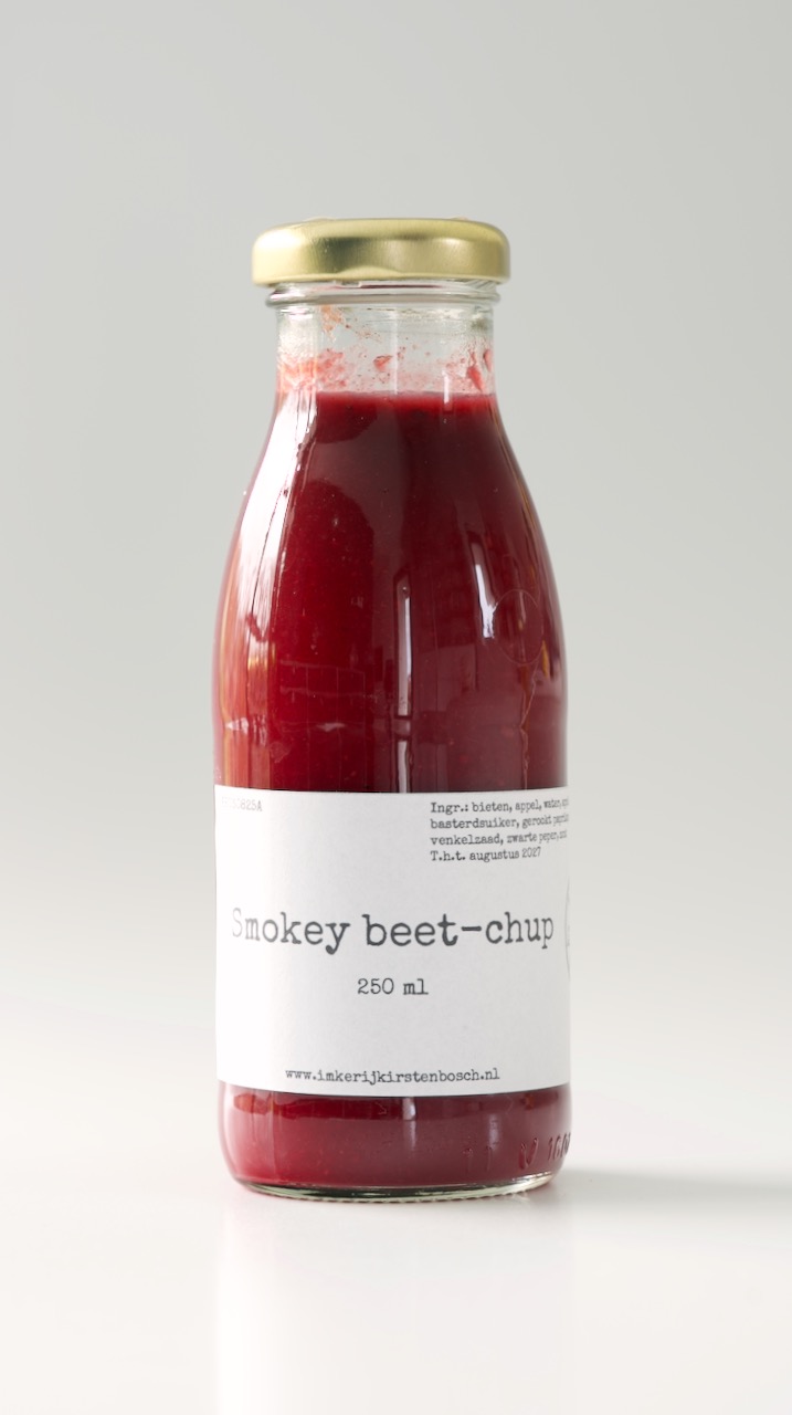 Een verrassende ketchup van onbespoten bieten uit de tuin van de imkerij. Lekker bij frietjes, gourmet of barbecue.